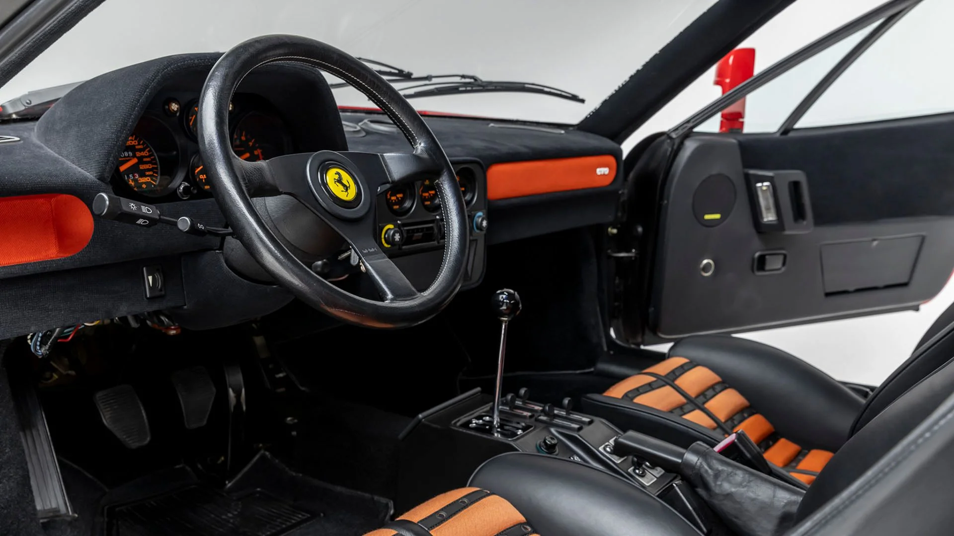 El interior del 288 GTO era espartano pero funcional. Ferrari redujo cualquier exceso de lujo para centrarse en lo esencial: asientos deportivos, un volante sencillo y relojes analógicos. El habitáculo transmitía la sensación de estar en un coche de competición homologado para carretera.
