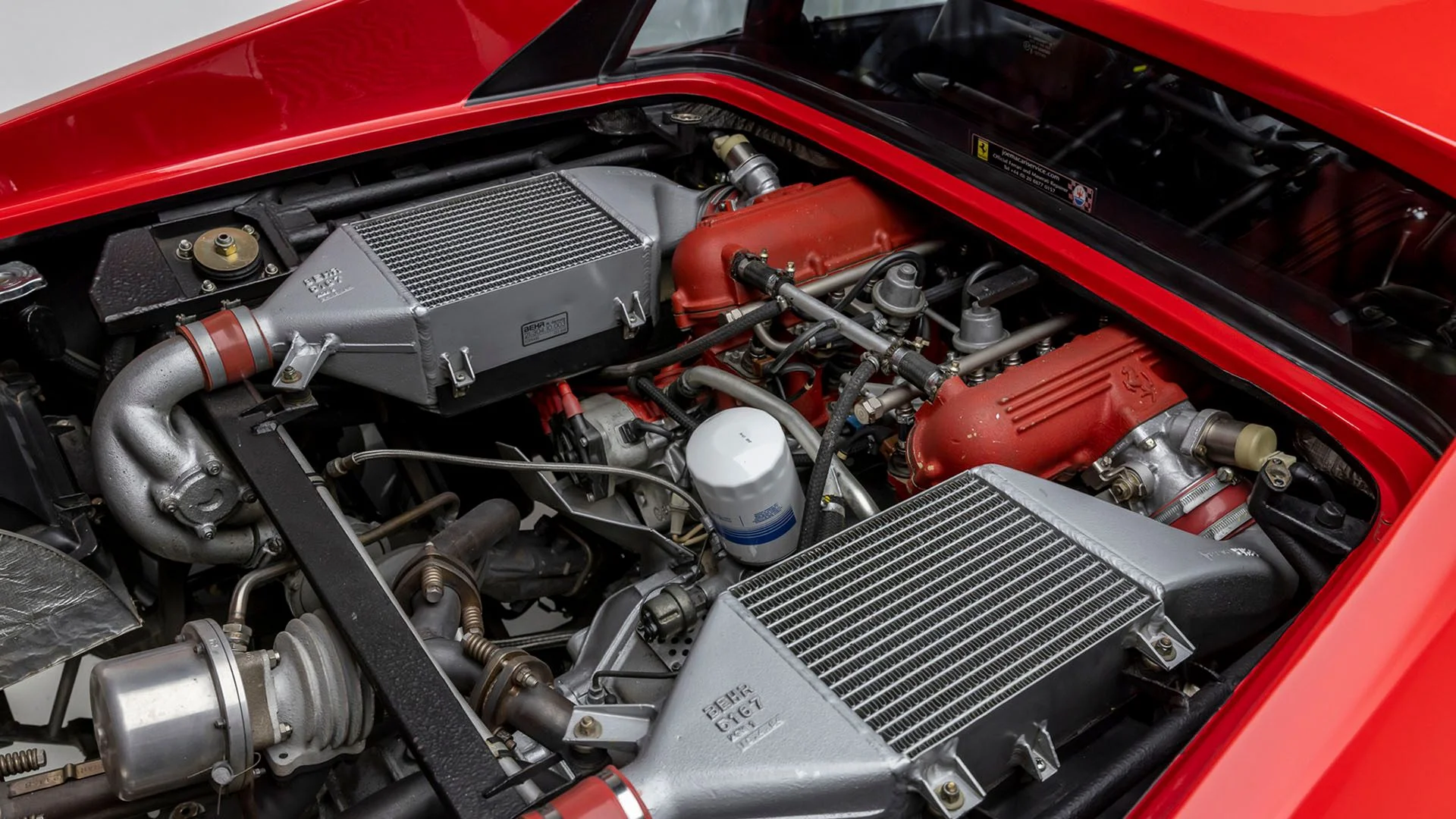 El corazón del 288 GTO era un motor V8 biturbo de 2.855 cc, dispuesto en posición central longitudinal, algo inédito en un Ferrari de calle hasta ese momento. Desarrollaba 400 CV a 7.000 rpm y un par máximo de 496 Nm, cifras que incluso hoy siguen siendo impresionantes.